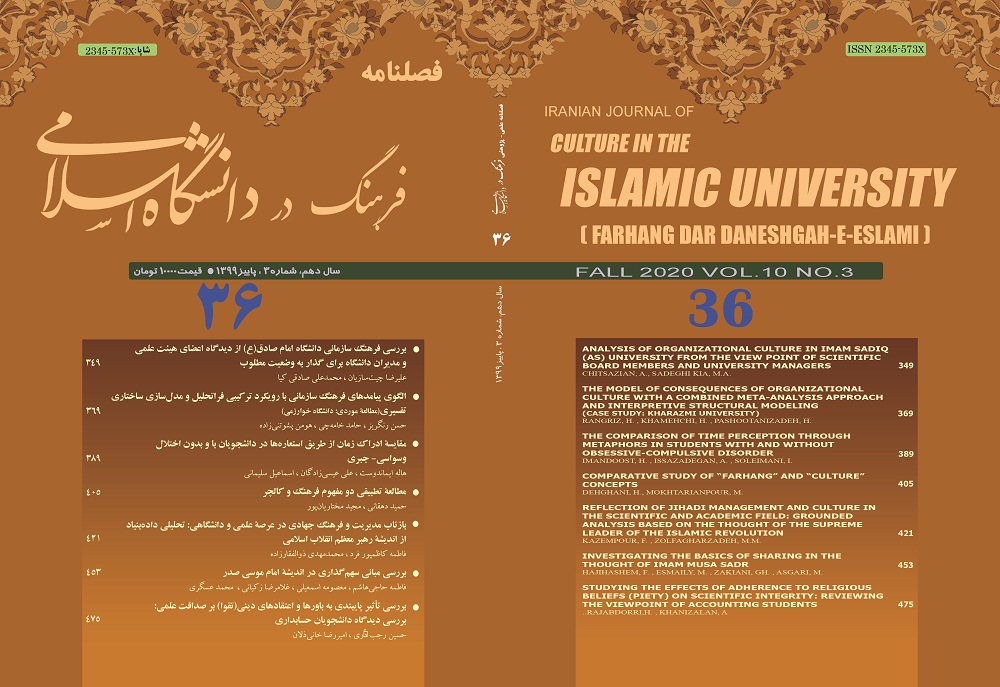 بر این اساس، ”فرهنگ در دانشگاه اسلامی“ به دنبال توسعة تحقیقات و مطالعات در زمینههای ذیل است: 1. مطالعه و تحقیق در زمینه ماهیت, محتوا و مؤلفههای فرهنگ سازمانی مبتنی بر آموزههای اسلامی؛ 2. شناسایی ارزشها و الگوهای رفتاری در جهت توسعة بهرهوری؛ 3. شناسایی و توسعة راهکارهای ایجاد و تقویت ارزشها و الگوهای رفتاری مبتنی بر آموزههای دینی؛ 4. نقش دانشگاه در شناسایی و ترویج فرهنگی مبتنی بر آموزههای دینی؛ 5. انجام تحقیقات به منظور شناسایی وضعیت موجود فرهنگ سازمانی در دانشگاهها و سایر مراکز آموزشی و پژوهشی و راهکارهای بهبود وضعیت فرهنگی بر اساس دیدگاه اسلام.