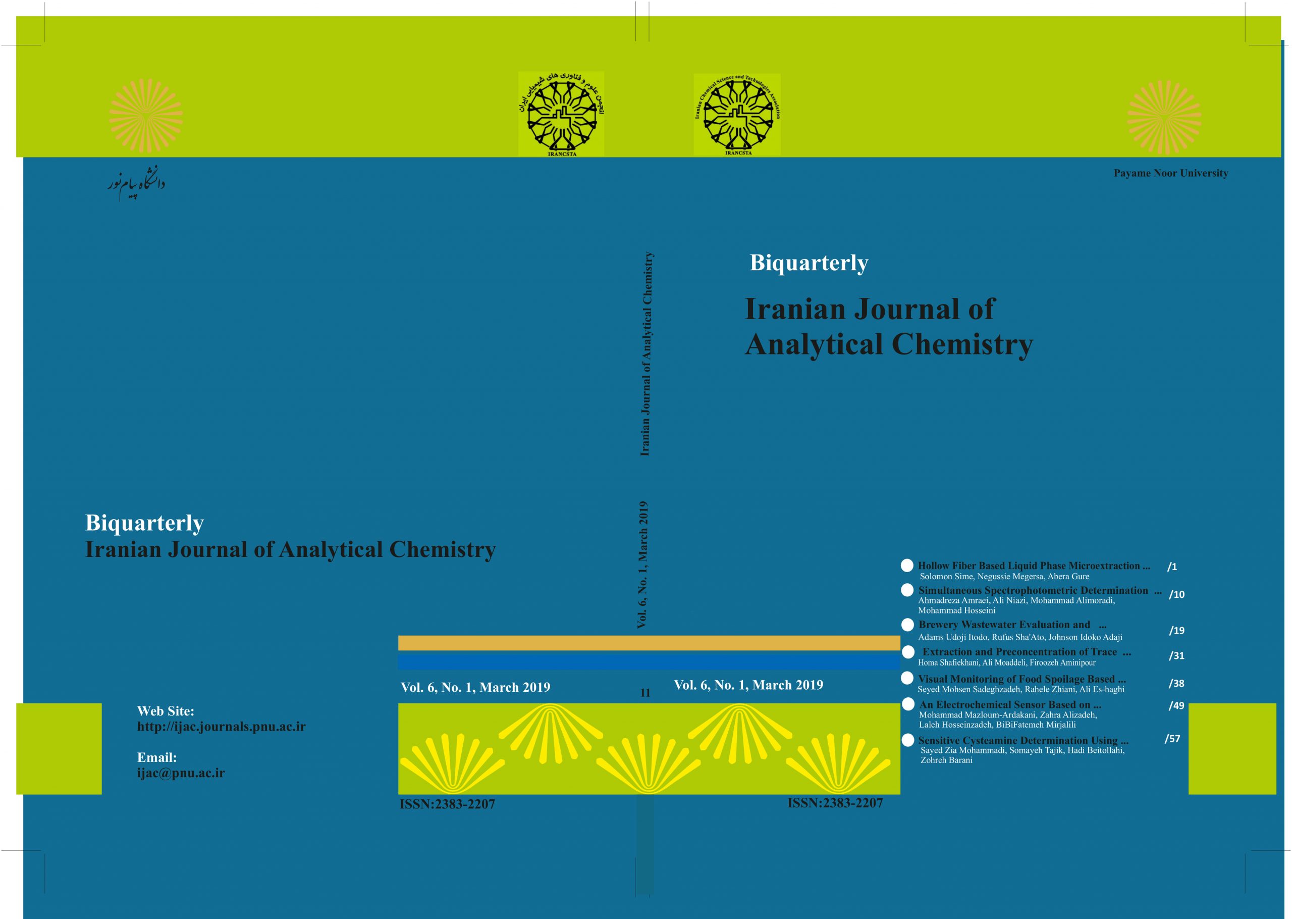 Iranian Journal of Analytical Chemistry (IJAC) provides a forum for the publication of original research papers and critical reviews in all branches of pure and applied analytical chemistry. Papers are evaluated based on established guidelines, including the fundamental nature of the study, scientific novelty, substantial improvement or advantage over existing technology or methods, and demonstrated analytical applicability. All manuscripts submitted to IJAC must be previously unpublished and may not be considered for publication elsewhere at any time during IJAC’s review period. Additionally, accepted ones will immediately appear online followed by printed in hard copy. Topics to be covered by this journal include, but are not limited to: – Analytical Chemistry Applications in Engineering – Atomic and Molecular Spectroscopy (UV, IR, Raman, NMR, MS, Microscopy, FS) – Chemical Sensors, Biosensors and Related Technologies – Chemometrics – Chemosensitive Materials – Chromatography and Electrophoresis – Composite Materials – Electroanalysis and Electroanalytical Techniques – Environmental, Clinical, Biological and Agrochemical Applications – Environmental, Health and Forensic Analysis – High-Throughput Screening – Ion Exchange Materials – Novel Extraction and Microextraction Procedures – Sample Preparation – Separation Techniques for Hazardous Substances – Thermal Analysis
